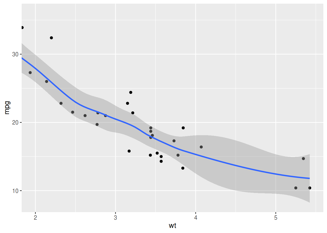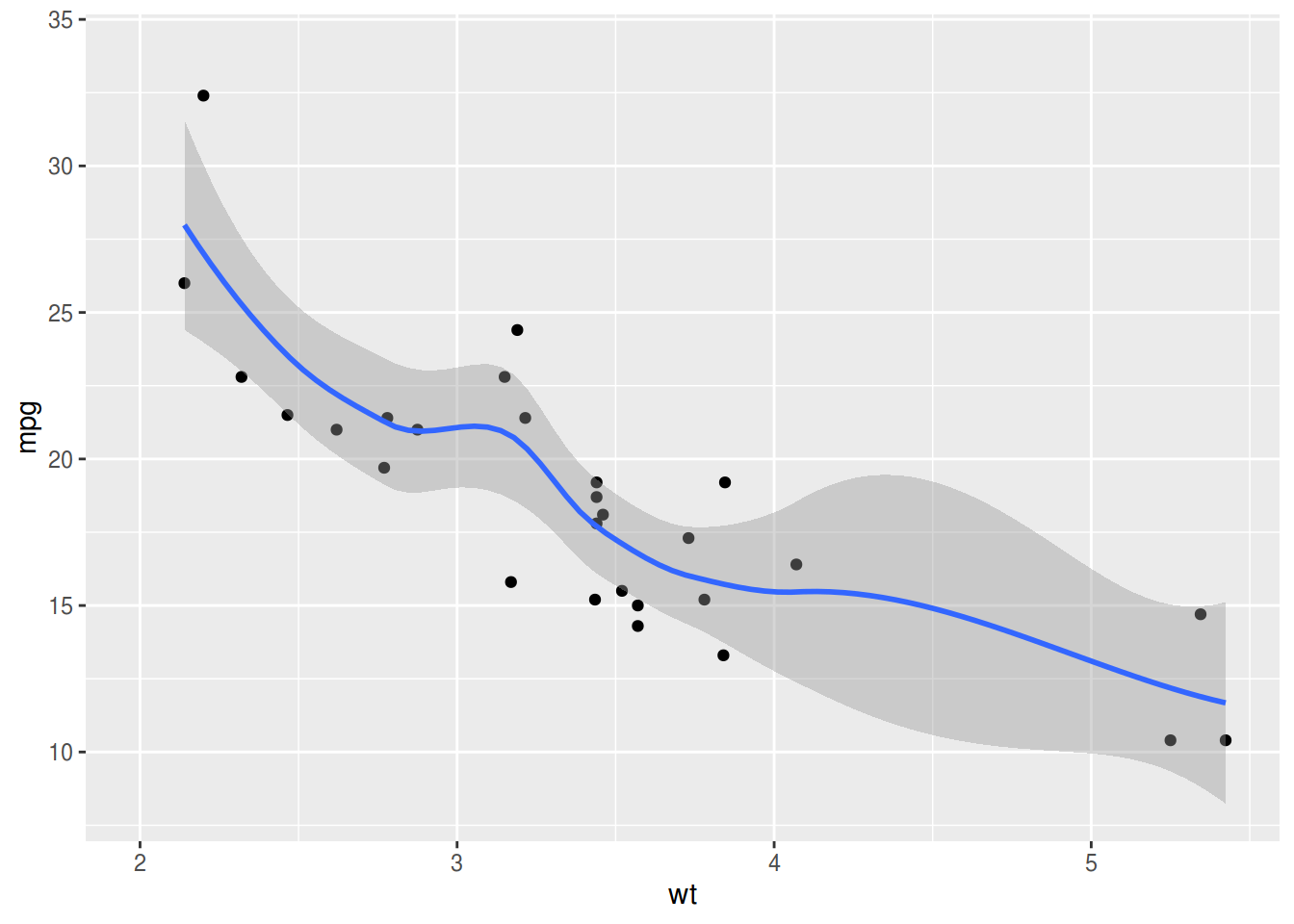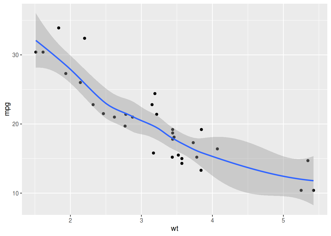 g <- qplot(wt, mpg, data = mtcars, geom = c("point", "smooth"))
