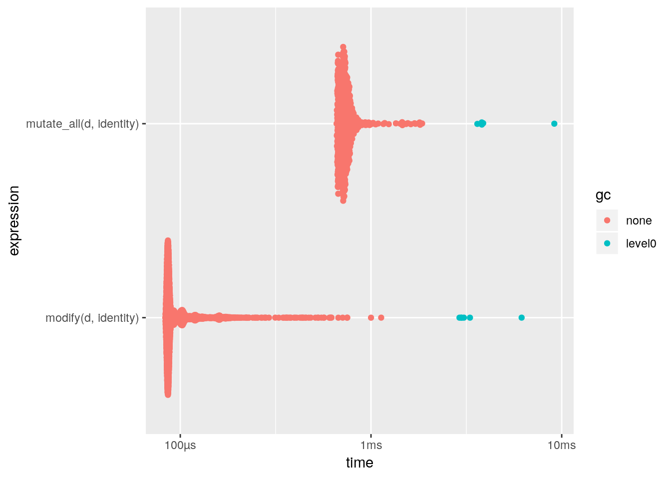 適用する関数が一つだけの時は mutate_all と modify は同じ結果を返すので、それぞれの性能を比較してみることにした。