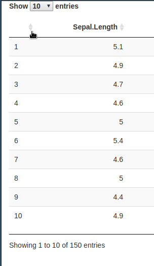 既定では1列目 (JSにとっては0列目) に行名を表示することになっているが,行名がないデータフレームを与えた場合は行番号を表示する.この1列目で並べ替えを有効にする基本的な方法としては以下のように options 引数を与えればよい.