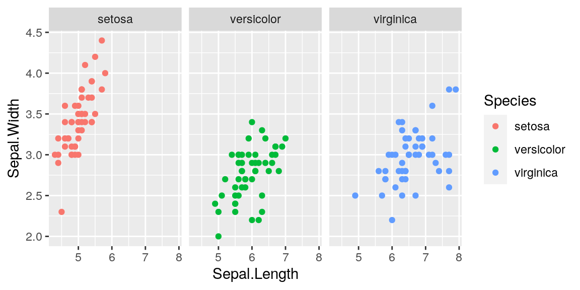 g <- ggplot(iris, aes(Sepal.Length, Sepal.Width, color = Species)) +
