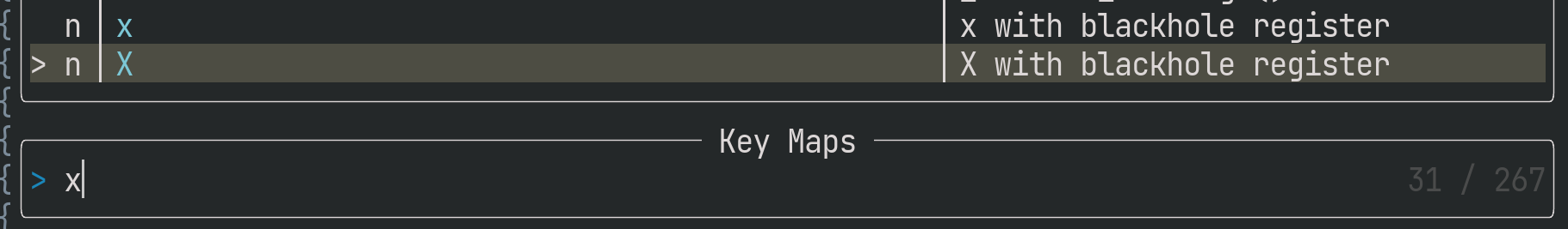 vim.keymap.set({ 'n', 'v' }, 'x', '<Plug>(x-with-blackhole-register)')加えて、<Plug>を使ったマッピングは文字数制限にひっかかりやすい問題や、半角スペースが検索時に<Space>と表示される問題があります。後者はsnake_caseやkebab-caseなどで単語を区切る手もありますが、スペースの方が読み易い人も多いでしょう。