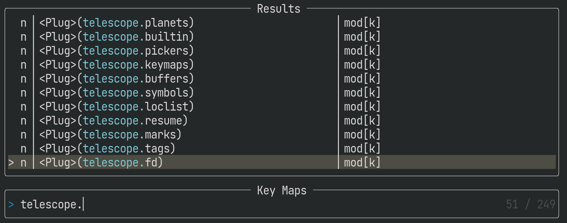 vim.keymap.set('n', '<Plug>(telescope.' .. k .. ')', v)