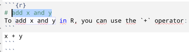 ChatGPT in Sourceを使い、コメントからコードを生成する場合、選択範囲にコメント記号(#)も含めておく必要あり#を含めなかった場合、Markdownで記述されたRコードと説明が挿入されてしまった。結果的に、以下の例ではR Markdownのチャンク内にMarkdown文書を記述してしまった
