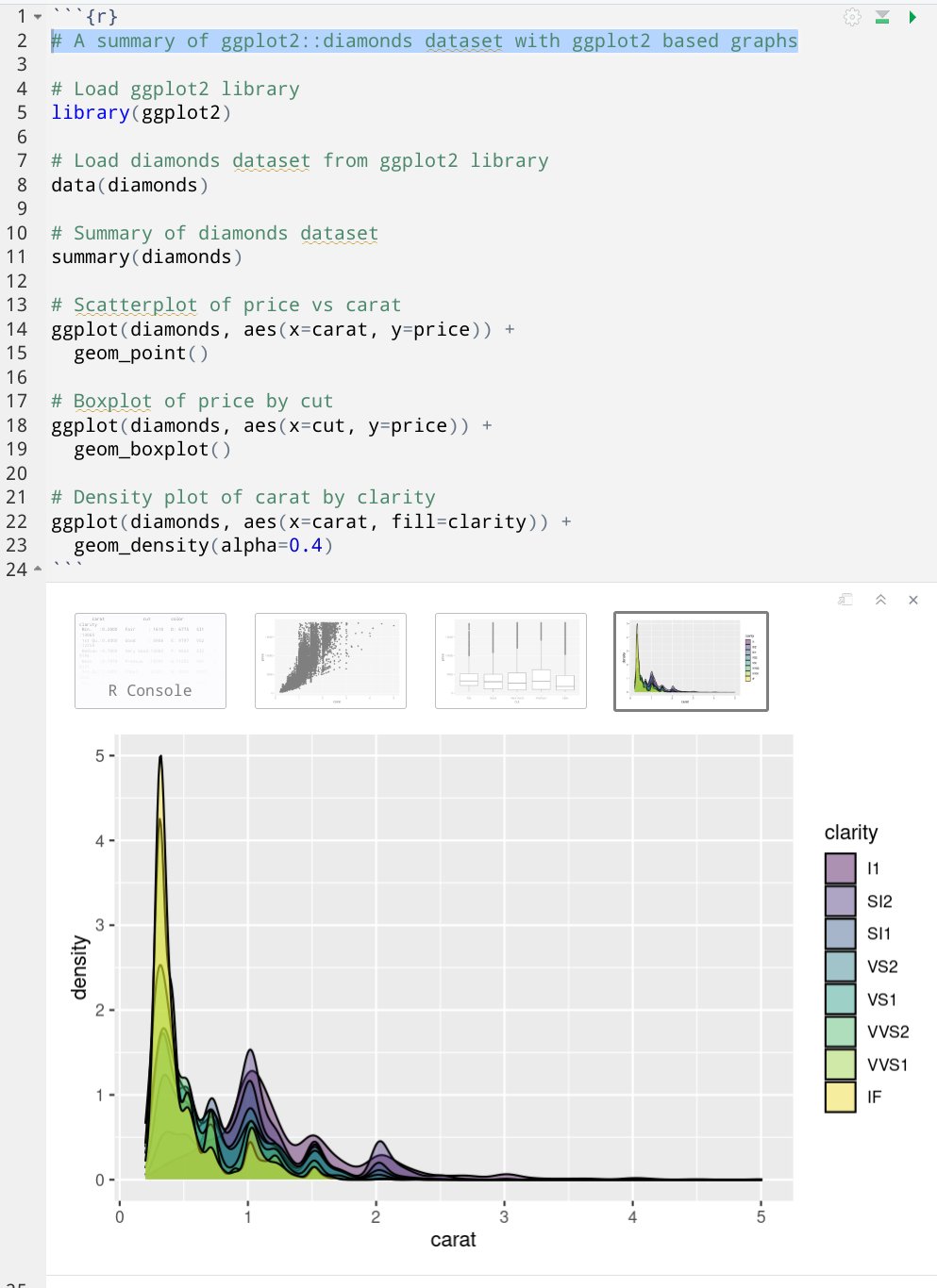 たとえば、ggplot2::diamondsデータセットをggplot2パッケージを使って要約してくれと頼んだ結果が以下。初めて使うパッケージの雰囲気を把握するケースではかなり威力を発揮しそうですね。