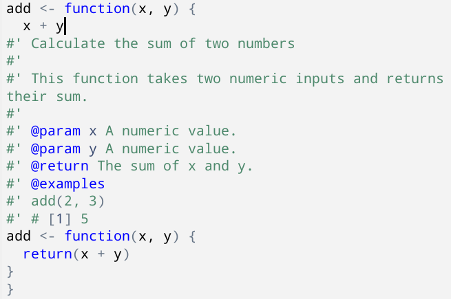 Add roxygen to functionを使い、関数にRoxygen2コメントによるドキュメントを追加する場合、関数全体を選択しておく必要あり関数内部にカーソルがあり、何も選択していない状態で、同機能を実行すると、カーソル行を元にRoxygen2コメントつきの関数が実装されてしまった。結果的に、以下の例では関数が入れ子になった