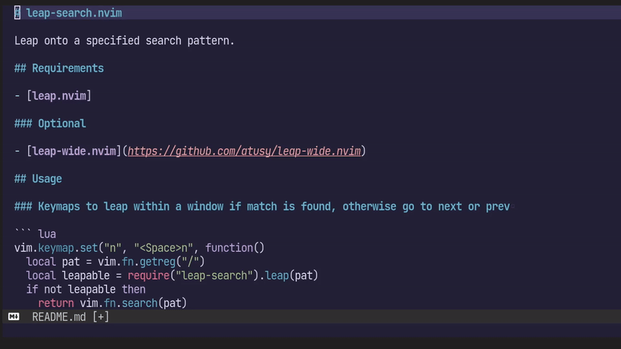 require("leap-search").leap("leap.{-}nvim")応用すると直前の検索パターンでハイライトされた箇所にジャンプなんてこともできますね。