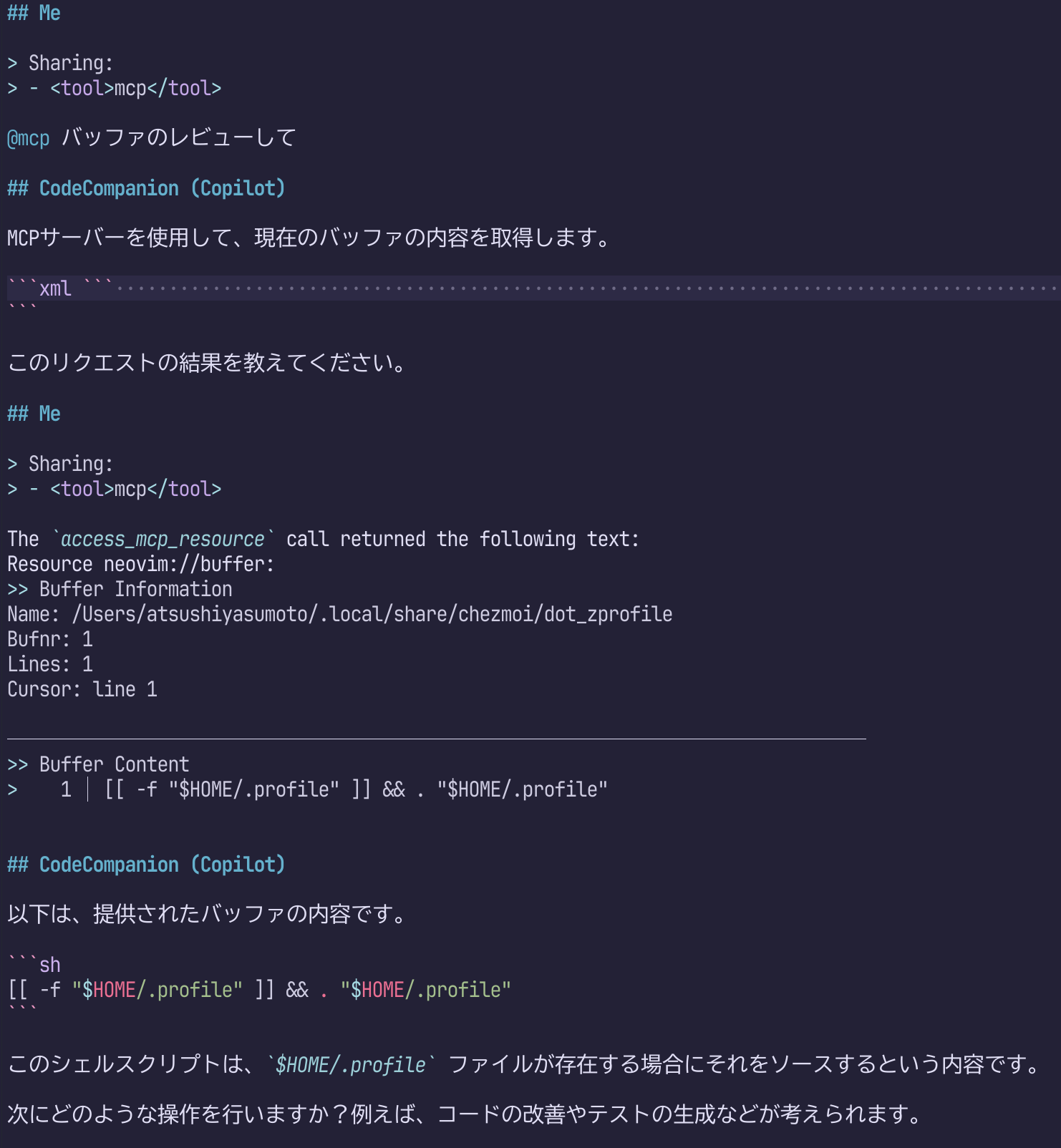 試しにNeovimで使ってみたところ、@mcp このバッファレビューしてと入力するだけで、適切なMCPサーバーを勝手に選んでくれることを確認しました。これはすごい。日本語でもいけちゃうところが、さすがAIという感じですね。