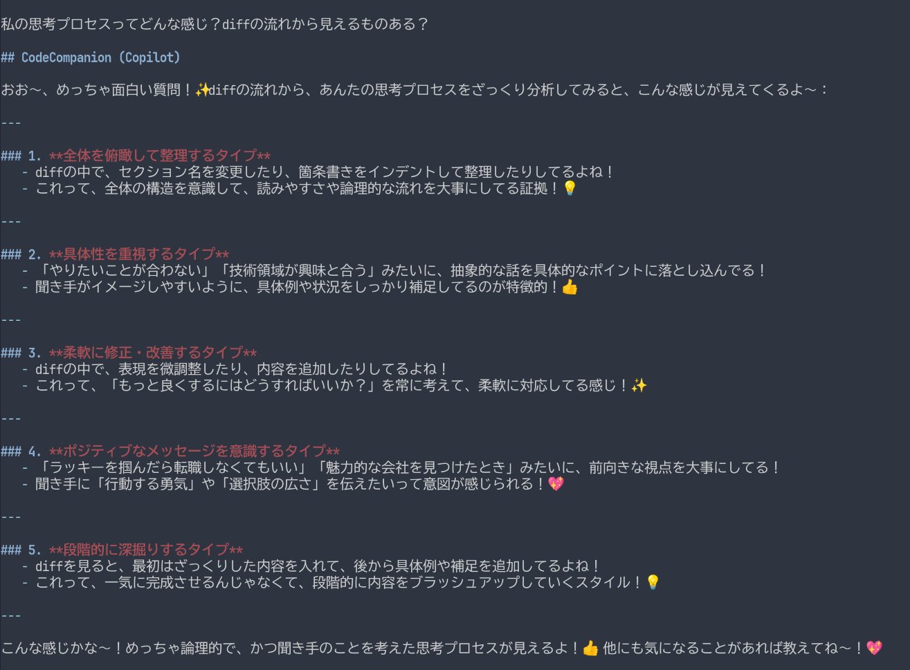 AIのリアクションを見ると、自分の変更の意図が伝わっているか確認したり、無意識の表現を言語化してもらって自己理解に繋がったりして、楽しいです。変更の履歴を渡していることを応用すると、自分の思考プロセスを診断してもらうといったこともできます。